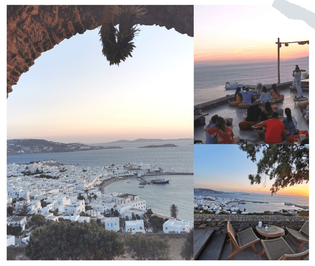 C’est the place to be pour le coucher de soleil à Mykonos ! Ce bar offre une vue panoramique imprenable sur toute la ville et ses moulins. Je vous préviens tout de suite, c’est un peu ambiance m’as-tu-vu, le parking est …payant, il faut faire la file devant l’entrée avant de s’acquitter d’une vingtaine d’euros par personne (avec une boisson comprise, tout de même).