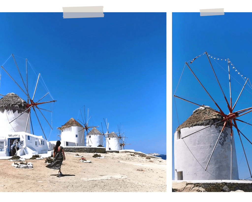 Il y en a plusieurs sur l’île mais les plus mythiques sont les 6 moulins à blé alignés au sommet d’une petite colline surplombant la mer et le quartier de la Petite Venise.