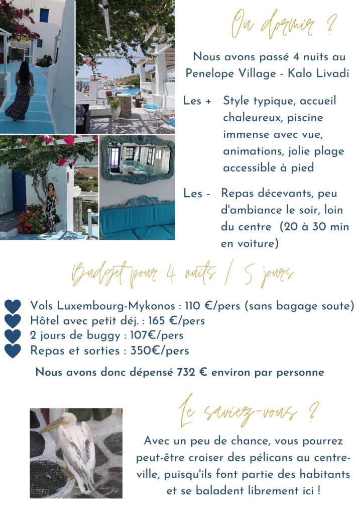 Vous l’aurez compris, Mykonos est l’île la plus chère de Grèce – suivie de près par Santorin. Si le billet d’avion peut être très bon marché, le plus gros du budget réside dans le prix des hôtels et dans le coût de la vie sur place. Pour vous donner un ordre d’idées avec ma sœur, nous étions dans un hôtel 3 étoiles (4 étoiles aujourd’hui) excentré et familial, hors saison (fin juin 2021) et avons dépensé chacune plus de 700 € pour 4 jours. Et c’est très peu pour la destination !
