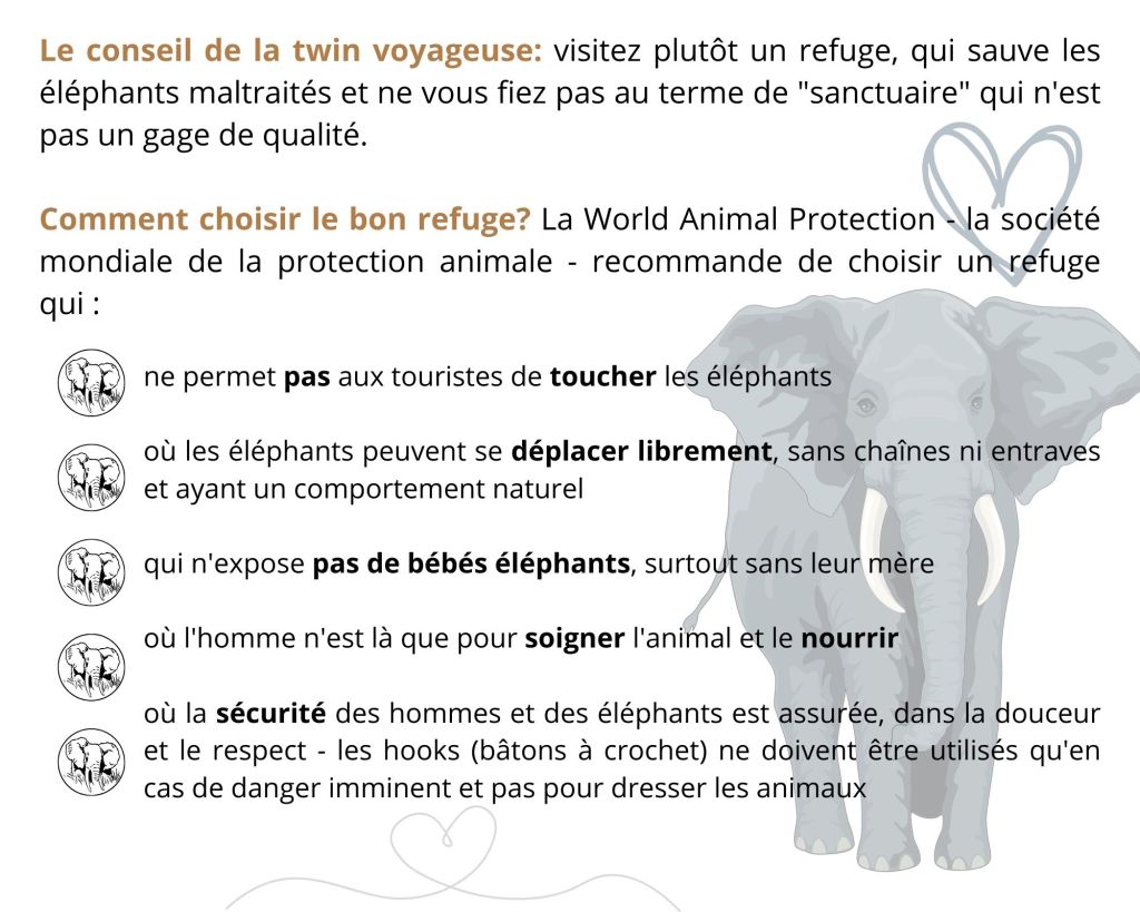 Nous voulions absolument recourir à un sanctuaire. Surtout, fuir à tout prix les compagnies qui proposent de monter sur le dos des pachydermes, d’abord parce que c’est un véritable supplice pour l’animal et aussi parce qu’il subit des maltraitances pour pouvoir éviter qu’il ne fasse tomber les touristes.