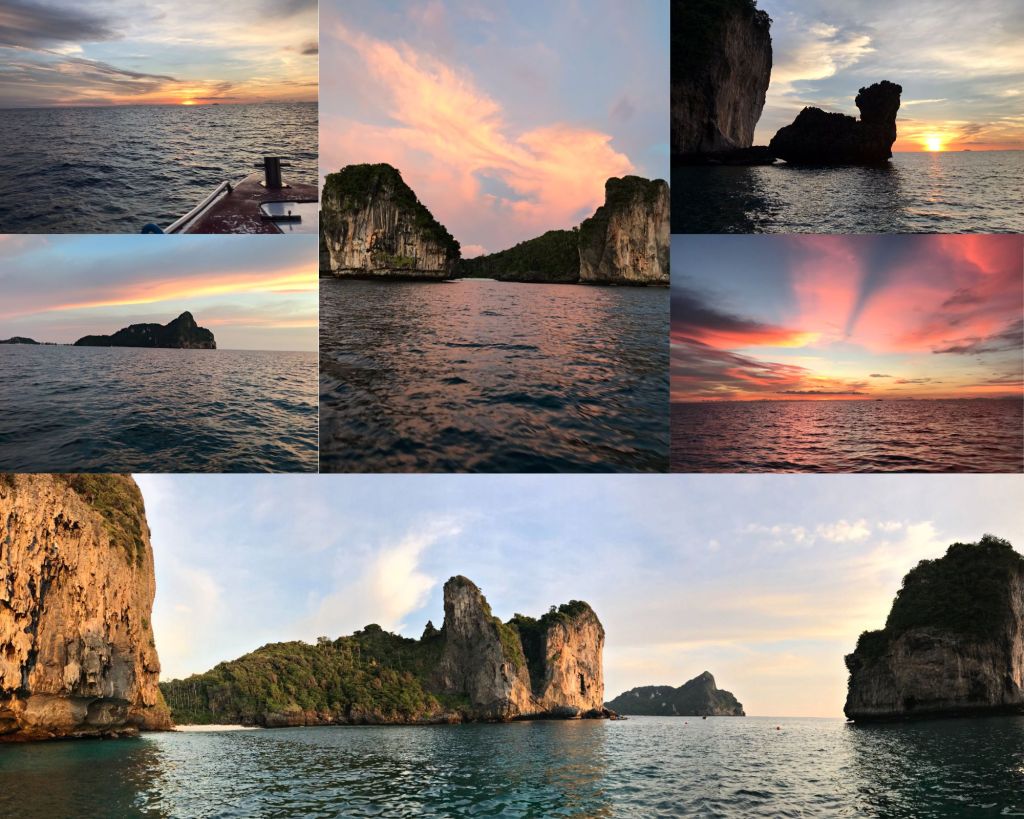 Mais heureusement, tout est bien qui finit bien. Nous sommes de retour vers notre hôtel (en vie et sans pleurs), et sommes même récompensées par un coucher de soleil d’anthologie depuis la plage de Railay… Inoubliable, comme celui de la veille.