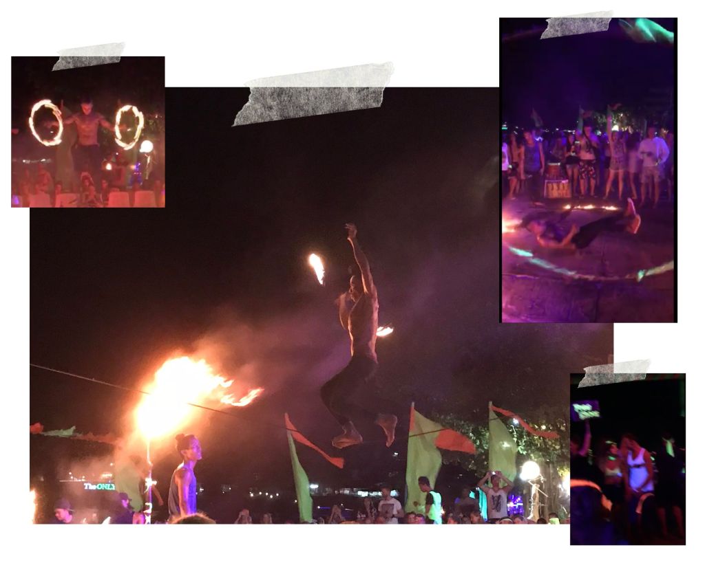 Alors c’est parti pour notre première Full Moon thaïlandaise, miniature par rapport à Koh Phangan. Ici, la chaleur est écrasante, même de nuit ! Ça change de Railay beach où nous avions un peu de vent ! Après une balade au centre-ville hyper animé, rempli de boutiques, de petits bars chill et bondés, nous rejoignons la fameuse plage de la Full Moon et sommes plongées dans l’ambiance de ces fameuses soirées de débauche thaïlandaises, où tout le monde est tatoué ou accessoirisé de fluo pour la nuit, où l’alcool voire la drogue (il ne faut pas se leurrer) coulent à flot dans une musique un peu style rave party et avec des spectacles de feu endiablés. Dommage je ne peux pas vous mettre de vidéo dans mon article mais vous imaginez bien la scène je pense, et bizarrement… on a bien aimé (nous n’avons rien pris d’illégal, je vous rassure) ! Par contre ici, quand on demande une simple petite bière on se retrouve d’office une mega pinte ! Mais l’incontournable d’une Full Moon party, c’est le « bucket », un seau contenant généralement une bouteille d’alcool accompagnée de canettes de soft avec pailles. Et c’est shooters offerts à ces dames !