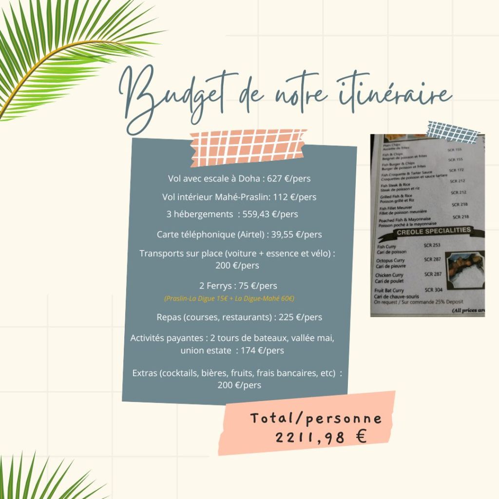 Il est totalement possible de réduire ce budget ! En effet, il nous fallait des logements avec 2 chambres, ce qui limite grandement les choix. Réserver plus à l’avance nous aurait sûrement permis d’économiser sur le budget. Et nous n’avons pas été les meilleurs en négociation, notamment pour les sorties bateau. Aux Seychelles, tout ou presque se négocie !