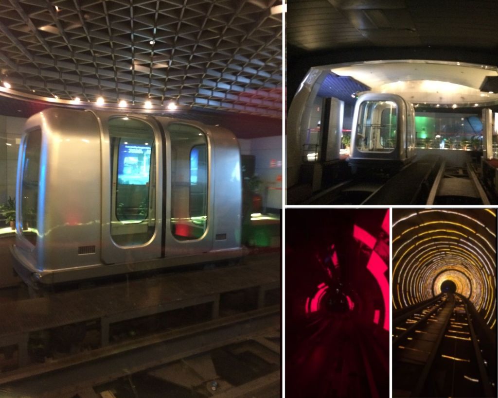 Ce soir, nous empruntons… le Bund Sightseeing Tunnel – juste à côté de Chen Yi Square – et embarquons à bord d’un genre de « capsule futuriste », passant sous le fleuve. La traversée est très rapide et assez chère (CNY 50 soit environ 7 € aller pour moins de 5 minutes), ponctuée d’effets sonores et multimédias psychédéliques, qui n’ont rien d’exceptionnel, mais qui se veulent être une attraction en soi. Personnellement j’ai trouvé ça unique en son genre.