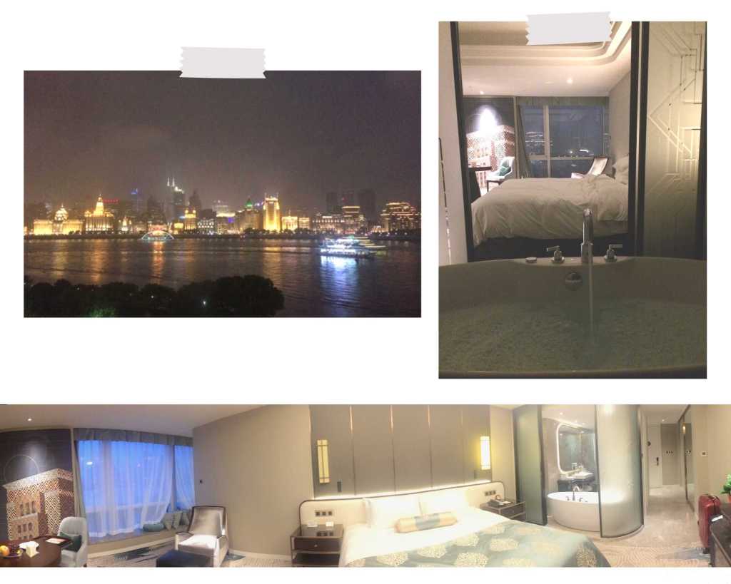 Lorsque je découvre la chambre et sa salle de bain semi ouverte, c’est l’émerveillement ! Elle offre une vue imprenable sur le fleuve et sur un autre quartier phare de Shanghai, the Bund.