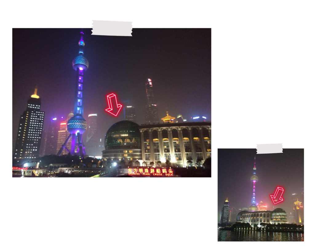 L’hôtel est bordé par 2 sphères aux extrémités, rappelant la forme de la célèbre tour voisine. Le quartier où nous nous trouvons s’appelle le District de Pudong et il est séparé du reste de la ville par le fleuve Hangpu.