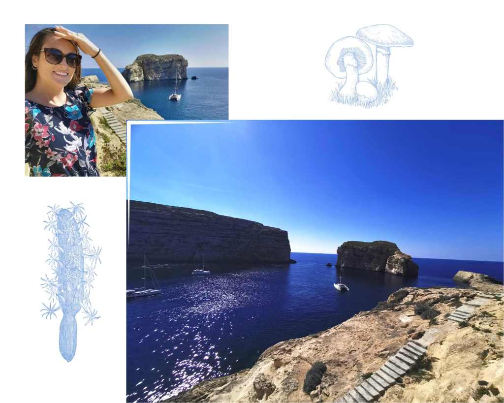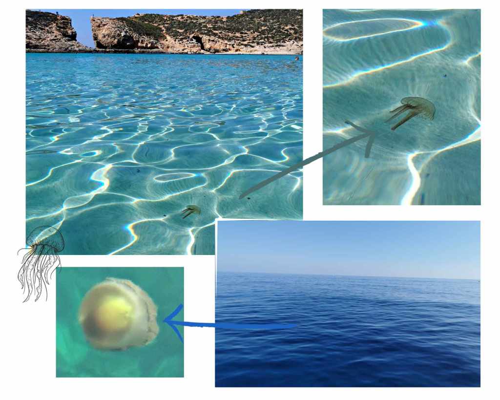 - Le Blue Lagoon est un lieu vraiment splendide, n’est-ce pas ? Qui ne rêverait pas d’y plonger à corps perdu, dans cette eau tiède, turquoise et si transparente ? Mis à part le fait que le Lagon peut très vite se retrouver surpeuplé par les humains en été (on veut bien partager mais quand même)… lorsque j’y suis allée en octobre 2022, figurez-vous qu’il était également peuplé de… petites méduses ! J’ai été moi-même piquée par une petite vilaine sur la main. Apparemment c’est courant à Malte (comme partout en Méditerranée d’ailleurs), mais n’ayez pas peur, ce n’est pas systématique car elles se déplacent. Il suffisait simplement de regarder où l’on nageait, elles n’étaient pas très nombreuses 🙂 Par contre, les méduses que je voyais au large lors du trajet en bateau avaient l’air bien moins sympathiques (ci-dessous en bas à gauche). Après vérification, il s’agit de la méduse « œuf au plat » (trop mignon) qui n’est pas dangereuse pour l’homme car très peu urticante. Vous pouvez tout de même consulter la carte des plages sans méduses de Maltaweather, elle est mise à jour quotidiennement.