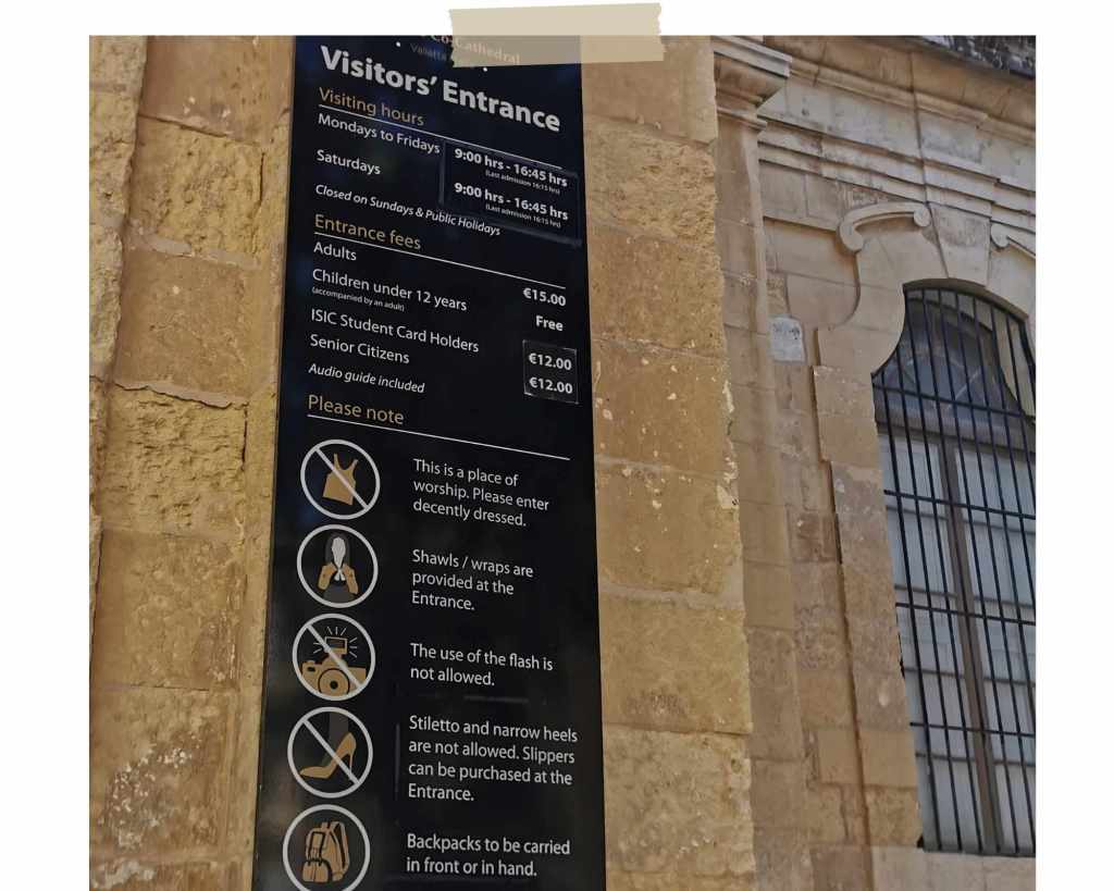 L’entrée à cette cathédrale coûte 15 € (elle est gratuite pour les enfants) et des règles sont à respecter pour pouvoir y entrer. Tenue correcte exigée (c’est la base) mais notez que les chaussures à talons aiguilles sont interdites – le sol étant en marbre. Autre spécificité, tout sac à dos doit être tenu devant soi ou porté à la main. Ces règles sont affichées (en Anglais) à l’entrée du bâtiment avec les tarifs et les horaires d’ouverture.