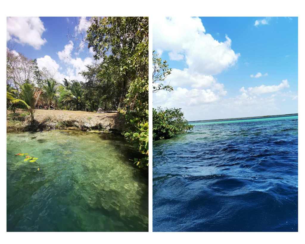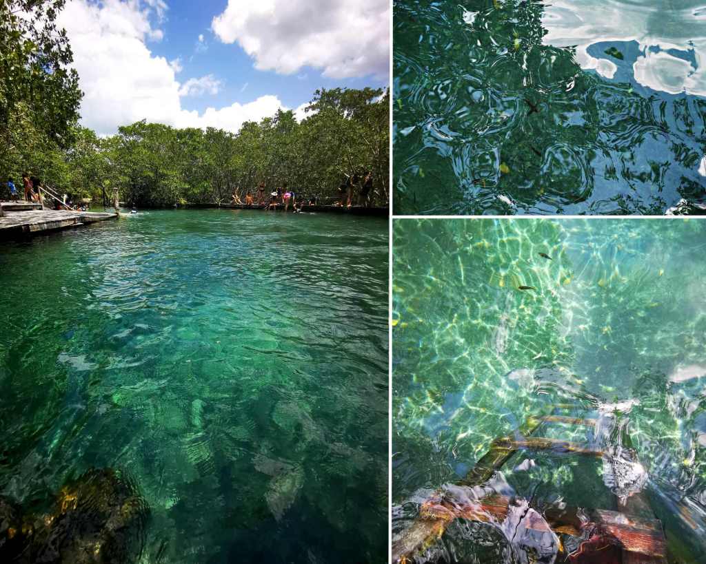 Puis nous faisons un arrêt au cenote de Yalahau appelé « Ojo de Agua » (oeil d’eau en Français). Nous traversons d’abord la mangrove de l’île par un petit chemin en bois et arrivons sur un cenote vert émeraude, rempli de petits poissons.