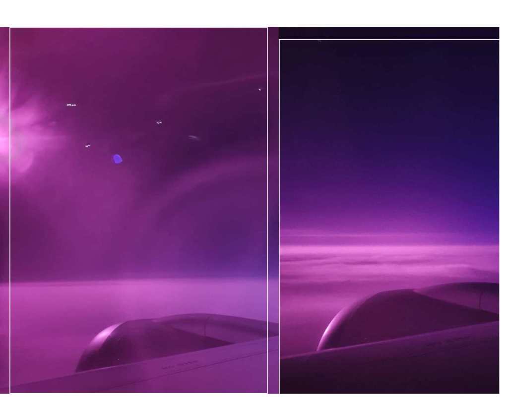 - Nous n’étions pas sereines pour le vol long courrier car nous n’avions jamais entendu parler de la compagnie Aeromexico. Tout s’est bien passé à l’aller mais au retour, entre Cancún et Mexico alors qu’il faisait beau au décollage, au moment d’atterrir à Mexico nous avons été pris dans une tempête de grêle. Nous avons cru vivre nos dernières heures et nous sommes prises dans les bras, tellement l’avion tremblait et le bruit de la grêle résonnait contre l’avion. Nous sommes bien arrivées à Mexico mais nous avions extrêmement peur de reprendre l’avion avec la même compagnie, dans la même tempête, pour 12h de vol. Et quelques heures après le décollage de ce long vol retour, notre cœur battait encore la chamade (on a failli mourir je vous rappelle). Tout à coup par le hublot, le ciel devient violet. ENCORE UNE TEMPÊTE ??? C’était à la fois incroyablement beau et extrêmement effrayant (ci-dessous). Nous n’avons jamais su à quoi était dû ce phénomène étrange (on nous a parlé de la lune rouge à notre retour mais regardez, c’était vraiment violet/rose flashy).
