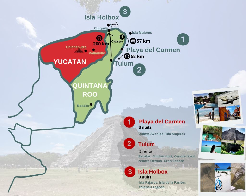 Nous décidons de privilégier 2 états sur 3, celui de Yucatán (OBLI-GA-TOIRE de chez OBLIGATOIRE puisque c’est là que se trouve LE site Maya le plus connu du pays) et Quintana Roo, car c’est ici que se concentrent les principaux spots touristiques, comme Cancún ou Tulum.